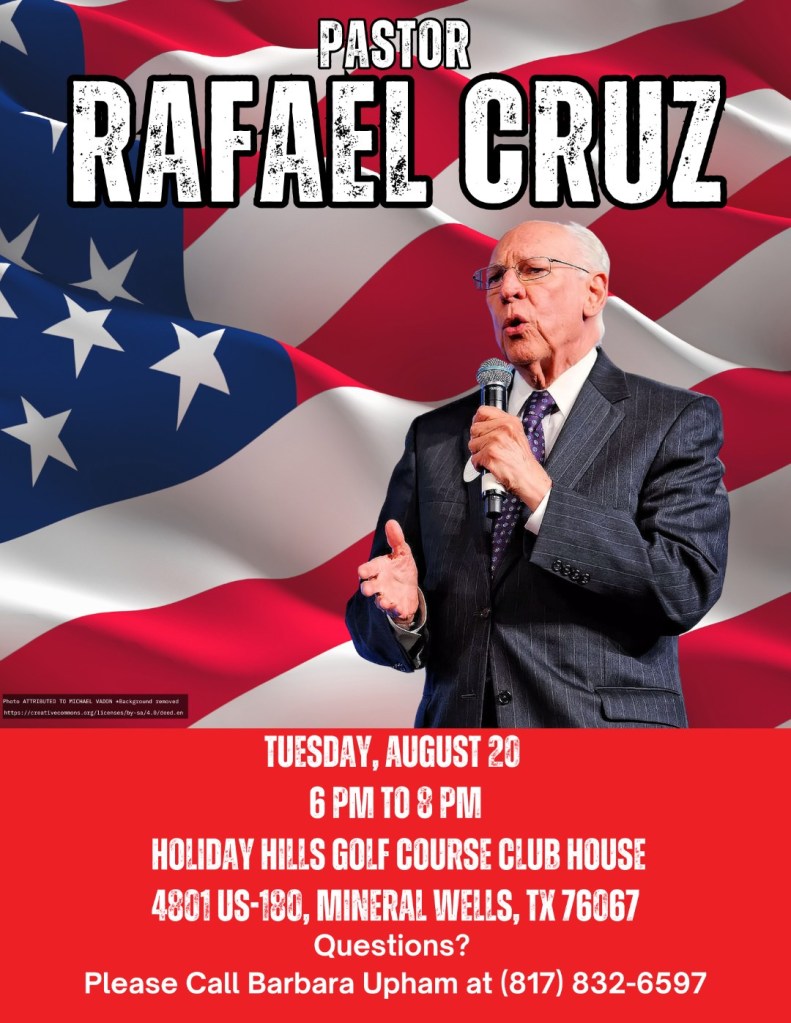 Pastor Rafael Cruz, father of Sen. Ted Cruz, will be visiting us on August 20th to speak about many of the issues facing our country. See the flyer below for more information!