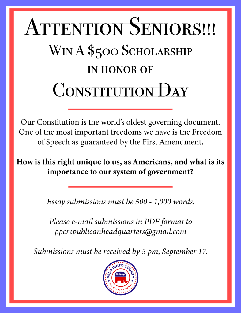 In honor of the upcoming Constitution Day holiday, we are hosting a scholarship essay contest for high school seniors enrolled in Palo Pinto County (Gordon, Graford, Mineral Wells, Santo, & Strawn ISDs).